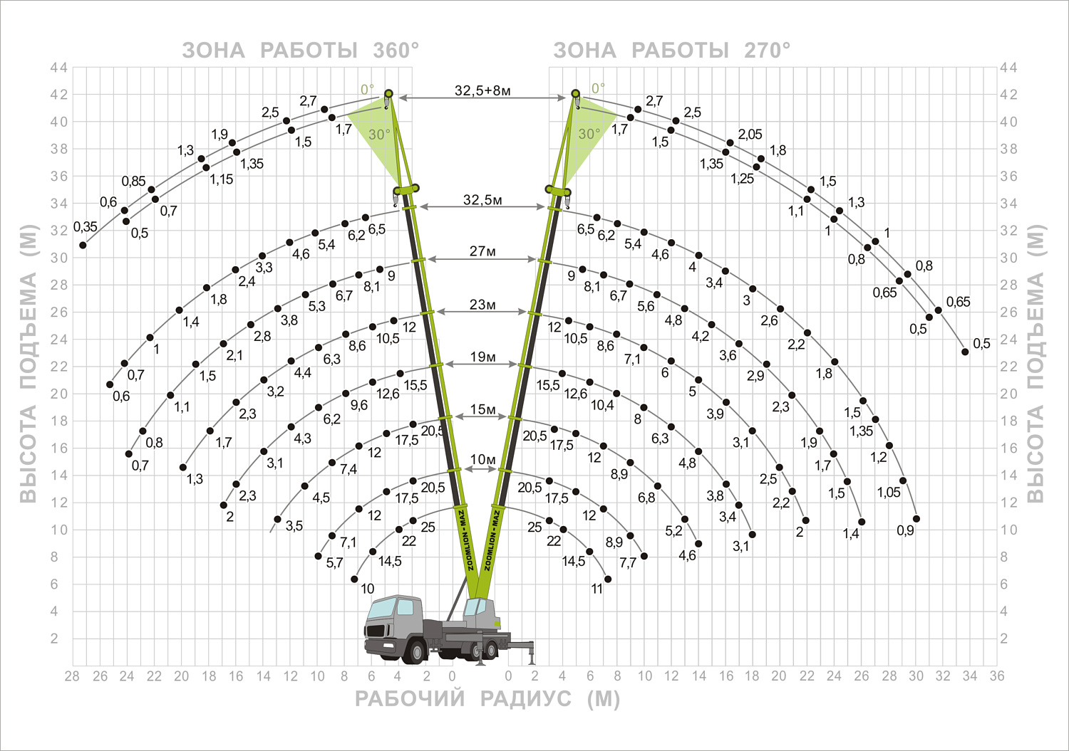 Длина стрелы, м, — 10,0-32,5