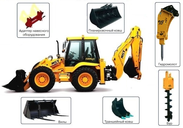 MST M644 Plus оснащен фронтальным челюстным ковшом с откидными вилами, что позволяет загружать и перемещать грузы на большие расстояния. Кроме того, экскаватор-погрузчик оснащен шнековым буром, планировочным и траншейными ковшами, а так же гидромолотом, который позволяет разрушать твердые материалы и бетон.