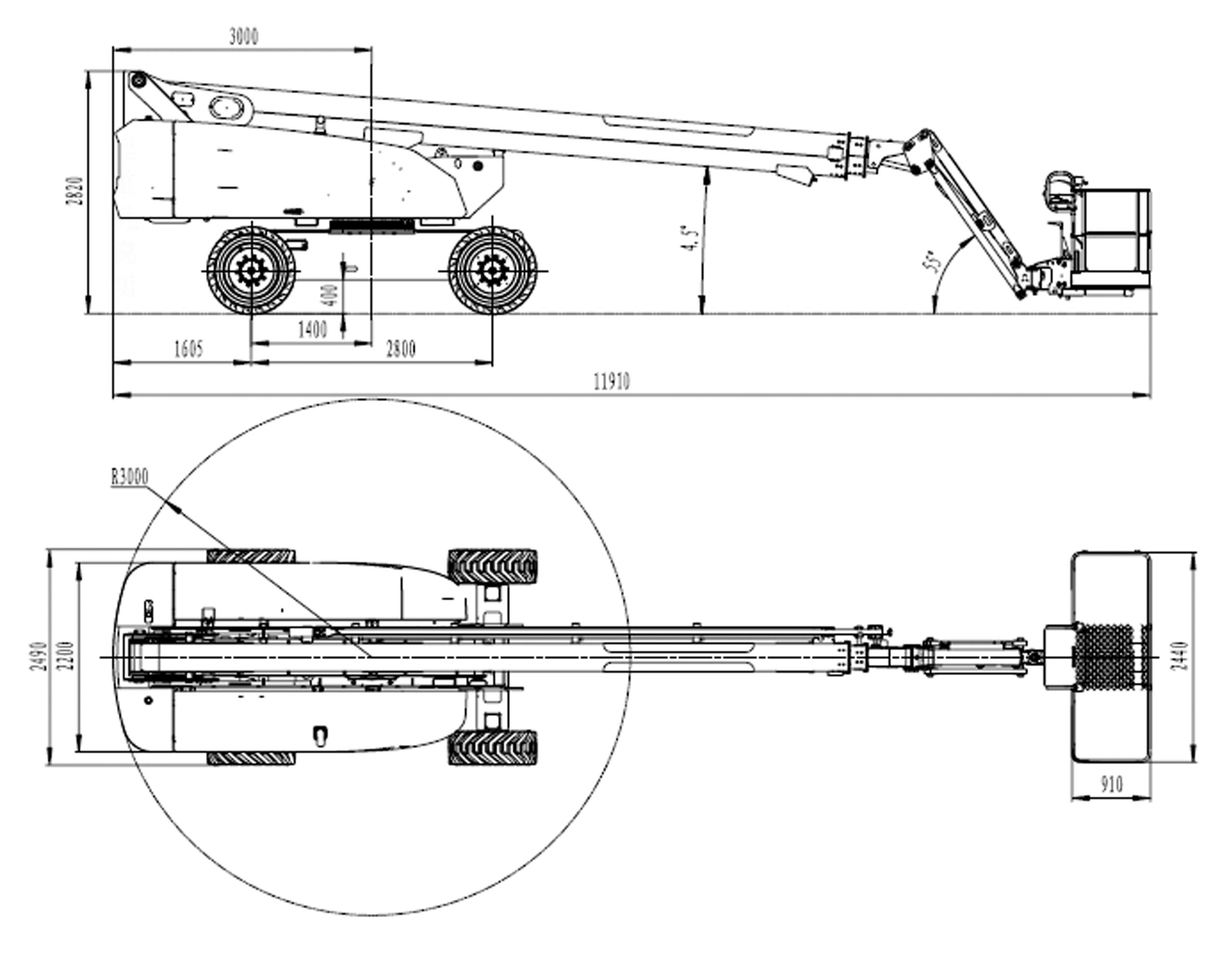 Машина оснащена поворотной платформой на 360° и системой наклона ±90°, что обеспечивает комфортное позиционирование. Компактные габариты в транспортном положении (длина 11,9 м, ширина 2,49 м) и хорошая проходимость (дорожный просвет 400 мм) позволяют легко перемещаться по объектам.