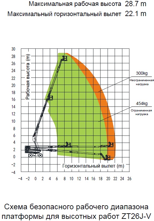 Автовышка Zoomlion ZT26J-V сочетает высокую грузоподъемность и маневренность, что делает ее идеальным выбором для строительных, монтажных и обслуживающих работ. С максимальной рабочей высотой 28,7 м и вылетом 22,1 м она обеспечивает доступ к труднодоступным местам, а грузоподъемность платформы до 454 кг позволяет работать с инструментом и материалами.